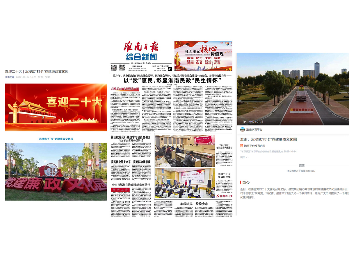 在祖國73周年華誕和中國共產(chǎn)黨第二十次全國代表大會勝利召開之際,建發(fā)集團黨建廉政文化園建成開園,淮南先鋒網(wǎng)、學(xué)習(xí)強國淮南平臺和淮南日報同步對集團公司黨建廉政文化園進行了宣傳介紹。