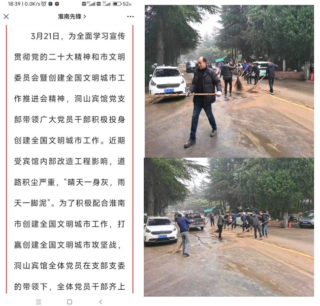 為全面學(xué)習(xí)宣傳貫徹黨的二十大精神和市文明委員會暨創(chuàng)建全國文明城市工作推進(jìn)會精神,洞山賓館黨支部以“主題黨日”為契機,帶領(lǐng)廣大黨員干部積極投身淮南市創(chuàng)建全國文明城市工作,打贏創(chuàng)建全國文明城市攻堅戰(zhàn),全體黨員干部齊上陣,不怕臟不怕累,清理了賓館院內(nèi)路面的垃圾,疏通了道路,為全市創(chuàng)建全國文明城市工作貢獻(xiàn)自己一份力量,此次活動被市委組織部作為優(yōu)秀主題黨日案例發(fā)布于淮南先鋒網(wǎng)。