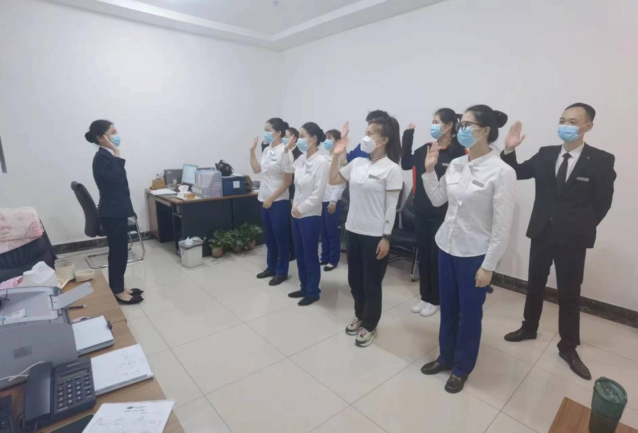 五月份,淮南迎賓館開展了招手禮培訓教育活動,通過在員工打卡處和員工食堂循環(huán)播放招手禮儀視頻營造學習氛圍,行政人事部深入部門班前會現(xiàn)場授課教學,部門督促員工將招手禮儀運用在對客服務(wù)之中,每日質(zhì)檢全員落實情況。