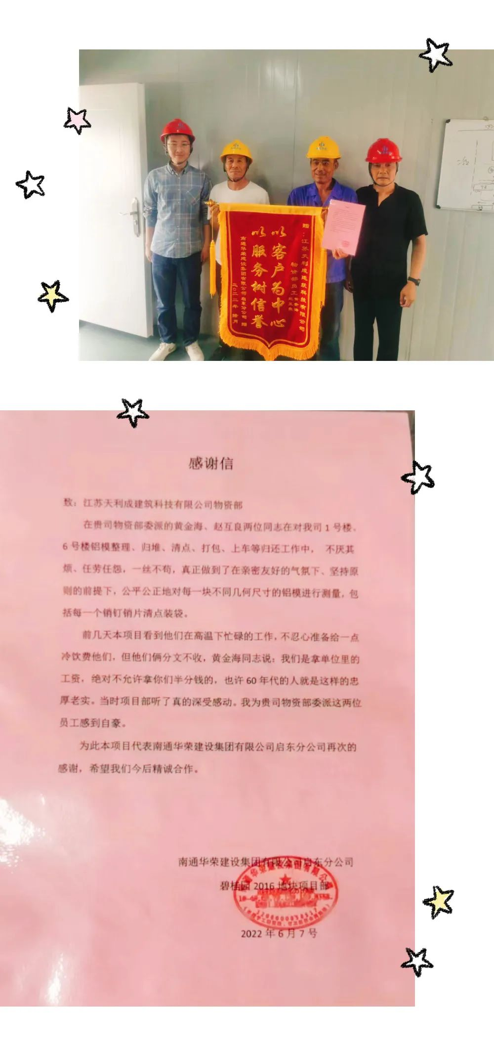 看看物資部的兩位西北漢子——黃金海和趙互良,樂觀的笑容書寫著對工作和生活的無比熱愛;堅定的目光充滿著對未來的無限憧憬!在啟東碧桂園項目退板期間,他們每天在項目方上班前,利用空隙就打好背楞包,方便客戶施工。雨天收板不停,材料全部泡在水里,為保證收板工期,他們用塑料袋套在鞋上繼續(xù)工作。項目領(lǐng)導(dǎo)被這種忘我的工作精神所感動,當(dāng)天就向天利成發(fā)來表揚(yáng)信和錦旗,并表示愿意與天利成企業(yè)開展深度合作,他們堅信這樣的團(tuán)隊值得信賴!