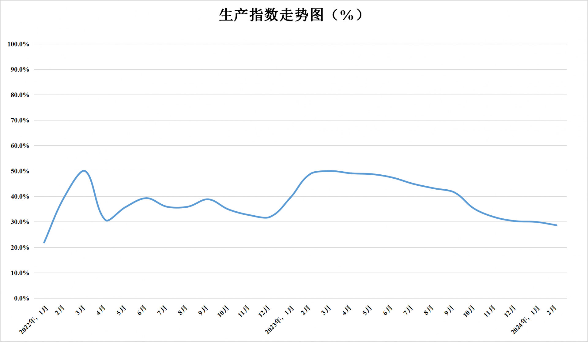 生產(chǎn)指數(shù)為28.7%,較上月下降1.3個百分點,低于臨界點,表面企業(yè)生產(chǎn)量較上月減少。