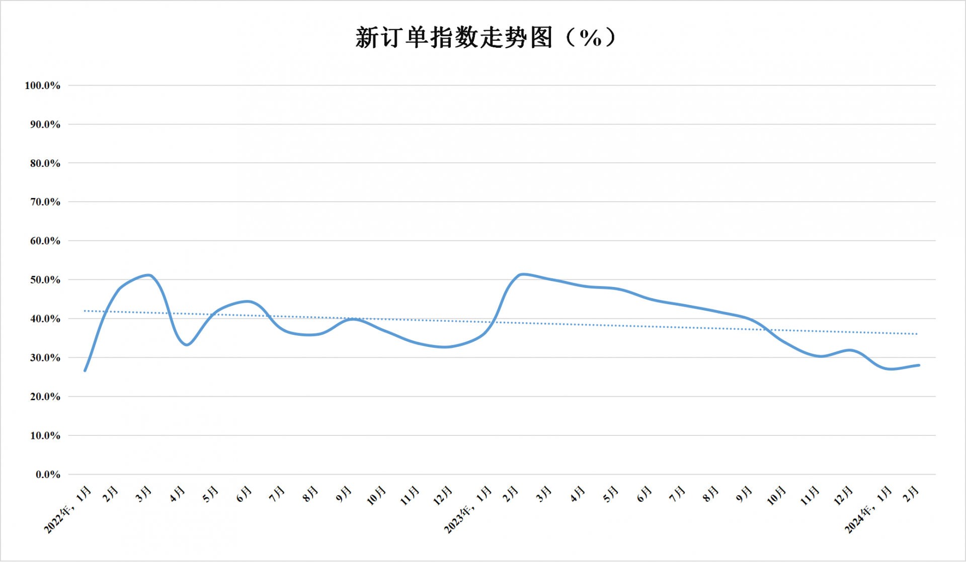 新訂單指數(shù)為28.0%,較上月上升0.9百分點,低于臨界點,表明市場需求較上月略有回升。