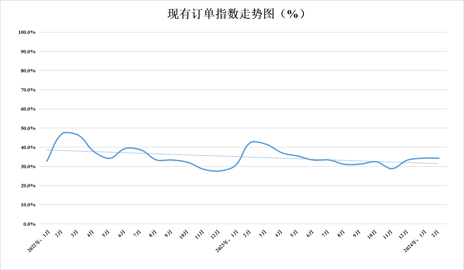 現(xiàn)有訂單指數(shù)為34.3%,較上月持平,低于臨界點,表明企業(yè)現(xiàn)有訂單較上月基本平穩(wěn)。